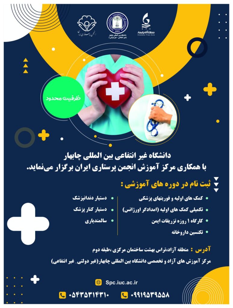 🏛️ دانشگاه غیرانتفاعی،بین المللی چابهار،با همکاری مرکز آموزش انجمن پرستاری ایران برگزار می‌نماید.
